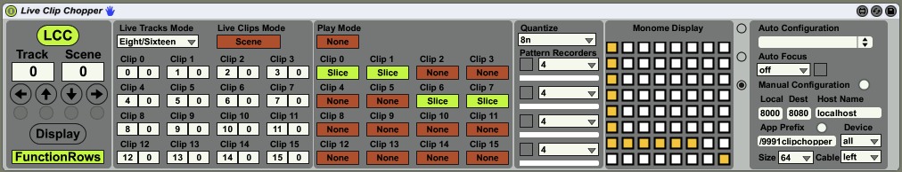 Description: A Max4Live device for controlling the playing position of clips within Live. Using a button grid interface, i.e monome, you can chop up and mash any beat, break or loop into new patterns.