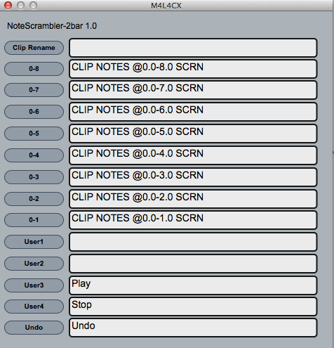 | Description: | First up. full credit must goto Stray at www.nativekontrol.com for providing the initial m4l4cx and ClyphX, you can download the latest version at http://beatwise.proboards.com/thread/992/current-version-clyphx-live-8 "You must install ClyphX for NoteScrambler to work." "Please not this only works in session view" NoteScrambler with reorder midi notes in a clip, you can set a range of notes to be scrambled, ie: the last measure for drum fils, or the middle for variations or the whole loop. because NoteScrambler works on measures I have provided a 1 & 2 bar example. see the ClyphX manual for further examples. Simply drag NoteScrambler after ie: a drum rack then click the various boxes to instantly reorder midi notes. |