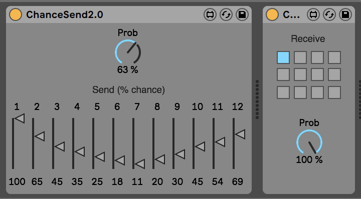 Instead it's the exact opposite: at 100% all the notes go _through_ the sender to whatever is placed directly after it; at 0% all the notes are blocked and routed to the receivers, depending on the weight set by the sliders - and of course anything in between blends the probability between the direct route and the receivers.