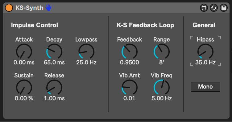 | Description: | This instrument is a polyphonic Karplus-Strong synthesizer. It has controls for shaping the initial impulse, as well as for shaping the feedback loop and output stage. The range of sounds it can generate is very wide -- from plucky plucks to long pads, from phat bass tones to screeching sizzles. Let me know how it works for you, and if you have any suggestions or requests to improve it. It's free and open-source, so give it a shot. See this link for more documentation: https://plugins.steinkamp.us/m4l-KS-Synth I have many other free / open-source devices available. Click my name or visit https://plugins.steinkamp.us/ |