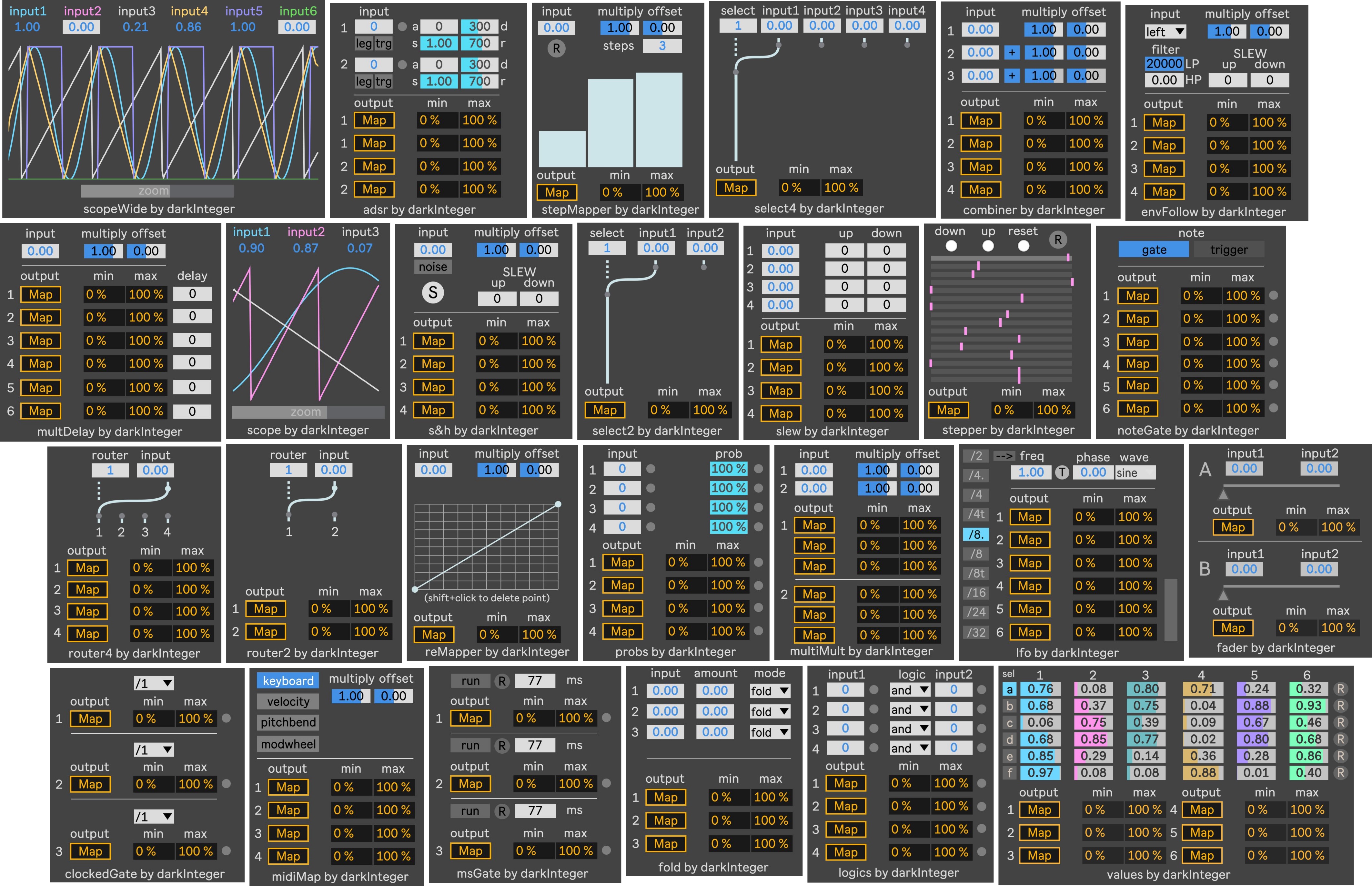 Description: | You can use these devices for modulating parameters inside Ableton Live. These devices has outputs for modulating parameters but has inputs too to receive modulation signals from other devices, this opens up new possibilities to build your own modulation system. Devices /in alphabetical order/: adsr /audio & midi device/ clockedGate /audio & midi device/ combiner /audio & midi device/ envFollower /audio device/ fader /audio & midi device/ fold /audio & midi device/ lfo /audio & midi device/ logics /audio & midi device/ midiMap /midi device/ msGate /audio & midi device/ multDelay /audio & midi device/ multiMult /audio & midi device/ noteGate /midi device/ probs /audio & midi device/ reMapper /audio & midi device/ router2 /audio & midi device/ router4 /audio & midi device/ s&h /audio & midi device/ scope /audio & midi device/ scopeWide /audio & midi device/ select2 /audio & midi device/ select4 /audio & midi device/ slew /audio & midi device/ stepMapper /audio & midi device/ stepper /audio & midi device/ values /audio & midi device/ User manual: https://drive.google.com/file/d/1MPjKIHbp4jr_ENEfTF6jxPS1mXut5lFp/view?usp=sharing |
