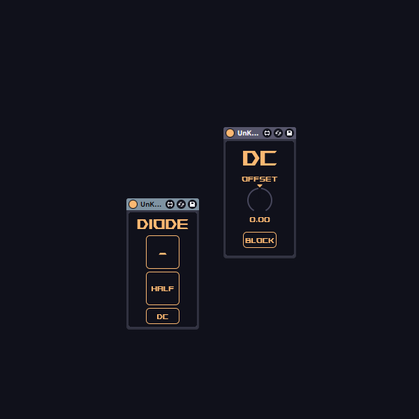 | Description: | This 2 devices are pretty self-explained: Diode acts like a diode rectifier (you could select the polarity and rectify full or half wave) DC adds some offset to the signal (use it before distortion or be creative with) Both have a switchable DC filter included |