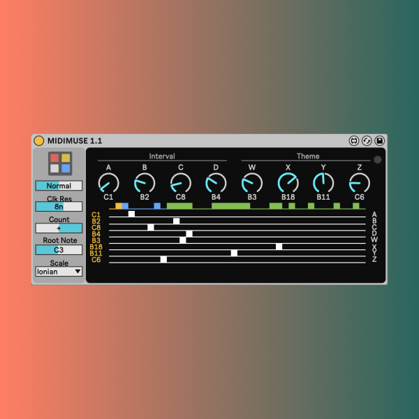 | Description: | MIDIMUSE is an algorithmic MIDI sequencer for use in Ableton Live. It is based upon the Triadex Muse, a sequencer based synthesizer originally designed in 1969. The original Muse produced it's sounds via a simple square wave oscillator. MIDIMUSE instead produces MIDI note data so that it can be used to sequence any Instrument or VST in Live. MIDIMUSE has been built in gen~ for sample accurate timing and high performance. Features: - Clock Sync - Sync with Live's clock. The clock resolution can be adjusted from whole notes to 32nd notes. - Counter Direction - The direction of the binary counter that runs MIDIMUSE can be reversed. This will more or less play your MIDI pattern backwards. To test this set up interval A, B, & C to C1, C2, and C4 respectively. Play the pattern to hear an ascending scale. Switch the direction to "-" to hear a descending scale. Due to they way the bits move through the shift register, unexpected results may occur when programming more complex patterns. Consider this feature experimental. - Rest mode - As found on the OG Muse. Turns the lowest note into a rest. - Root note transposition. - Scale Quantizer - 14 selectable presets. - Mini "Light Show" display (from the original Muse user manual - "See the music you create on your Muse expressed in color and motion". - Step advance - The mini "light show" display doubles as a step advance button when the transport is not running. - Reload - A small button is provided on the right side of the device should you wish to clear the bits from the shift register and start the melody from the beginning (there may be an update in the future to reset at transport 1. 1. 1. - we'll see). Please note, for best results use reload only when transport is stopped. - Intuitive GUI - The Interval and Theme "sliders" can be adjusted via the dials or the slider UI below. - Mapped to Push - Control MIDIMUSE from an Ableton Push controller User guide coming soon (original Muse programming guide available here (https://till.com/articles/muse/TriadexMuseProgrammingManual.pdf) Please check out Donald Tillman's excellent Javascript Muse here (https://till.com/articles/muse/). System Requirements: MIDIMUSE requires at least Ableton Live 10 and Max 8.3. It has been tested as working for Mac. Should be fine for Windows. Feel free to get in touch if you have any issues. |