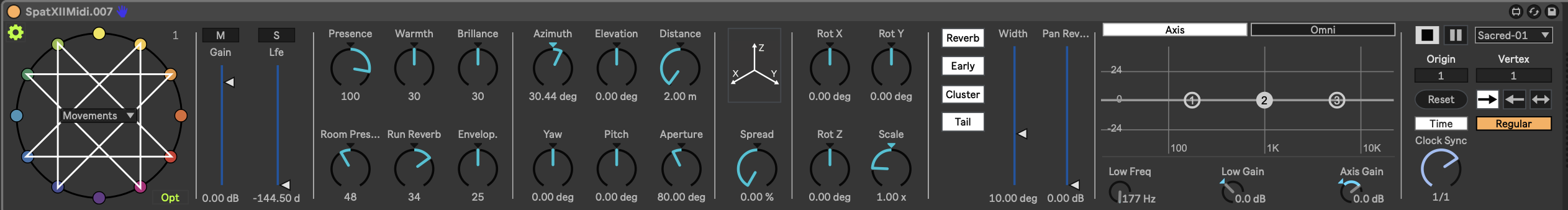 | Description: | This Max for Live device enables control of sources within Spat Revolution, based on geometry and LFO concepts. It offers comprehensive control over all source parameters, allowing automation of any parameter as needed. For the Geometry feature, there are two modes: “Movements” and “Steps.” In Movements mode, sources move linearly along the chosen shape’s path, while in Steps mode, they jump from edge to edge of the shape. The LFO feature provides basic movement tools, including saw up, saw down, sine, triangle, and random waveforms. Each mode includes adjustable parameters such as origin, direction, sync rate, and time rate, allowing for customized control. This device was initially developed for my immersive musical project, “42,” which explores the role of circles and geometry in music creation and spatial diffusion. You can check my other products and for more check my instagram Have fun & Take care |