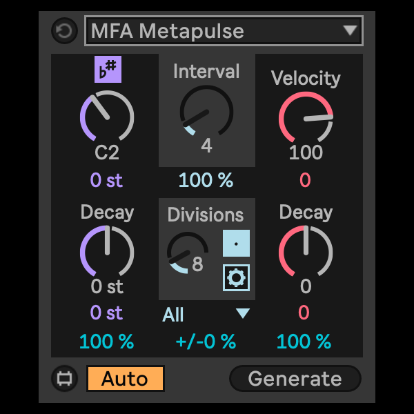 | Description: | Inspired by our real-time Pulse Engine generator, Metapulse probabilistically generates new note pulses at the specified interval of the current grid setting, with a random division within the maximum selected each interval to generate complex note patterns. Pitch, velocity, and length can all be randomized each interval, have positive or negative decay imposed each interval, and have the amount of that decay randomized each interval as well. Explore different quantization restrictions - and enter the advanced mode to explore minimum and maximum limits on each pitch, velocity, or length decay, and decide on a behavior when those limits are reached: Clip at the obtained limit value, Wrap back to the upper limit, or Fold to reflect back in the opposite direction. Info View Annotated: Learn all you need to know directly in Live - just open the Info View and hover your mouse over any parameter. Scale Aware: Natively integrated with Live 12's scale and key for seamless workflow. Theme Adaptive: Device colors automatically adapt to your preferred Live theme. Already comes included with MIDI Toolset 002. Requires Live 12 running Max 8.6.x |