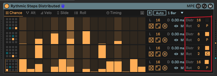 | Description: | evenly distribute n steps across the sequence. rotate n steps. pass thru the random value, or go with constant max value. midi map all of the above parameters. |