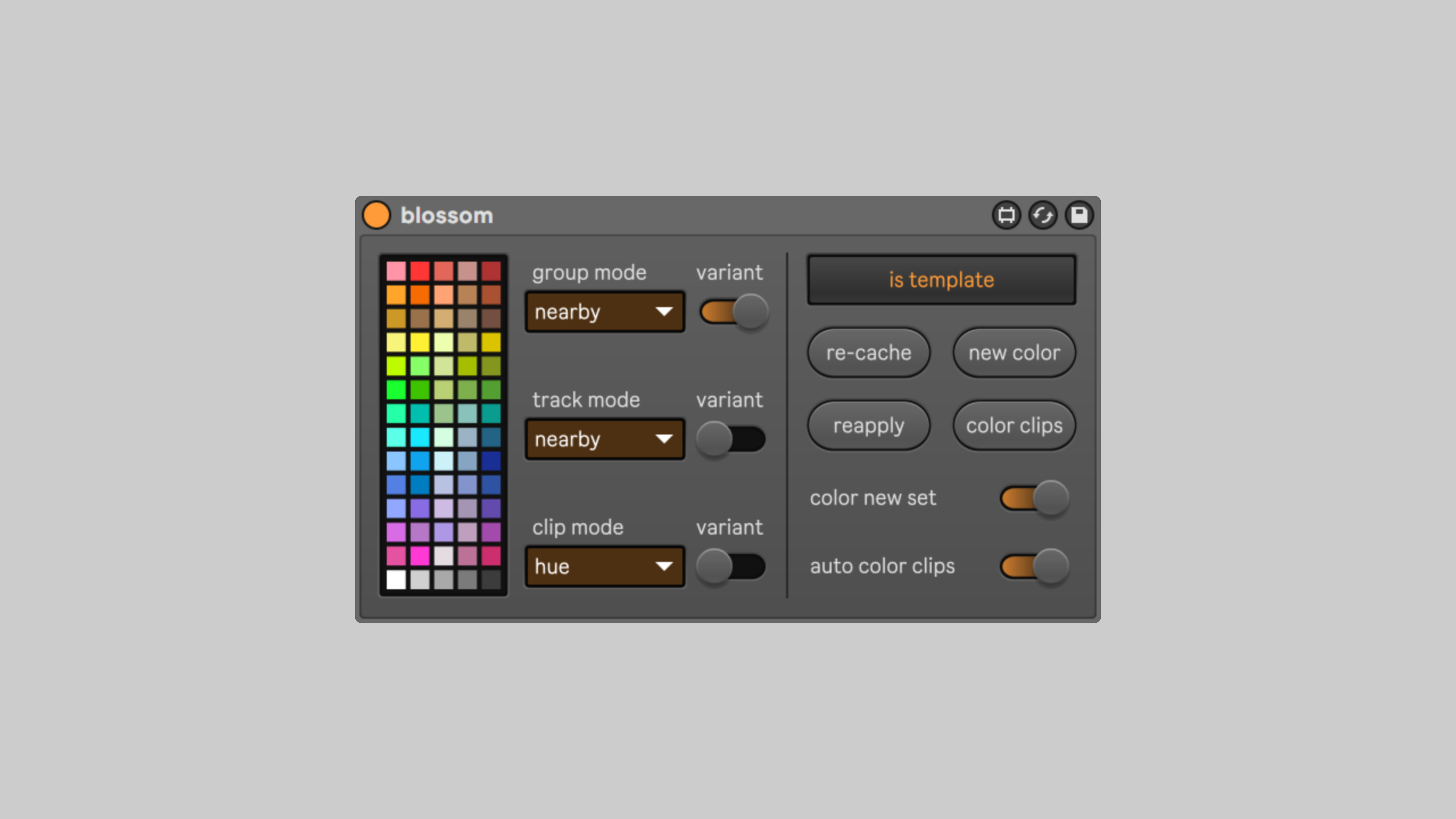 | Description: | blossom is an automatic tracks & clips coloring max for live device. with multiple carefully designed coloring algorithms, you can make your ableton live project look eye pleasing, while keeping clear track structure without interrupting your production flow! --- requirements: - Ableton Live 11+ (Suite or Standard with Max for Live) - macOS 10.13, Intel i5/Apple Silicon, 8GB RAM - Windows 10, Intel i5, 8GB RAM note: automatic coloring will add undo action into your undo history. |