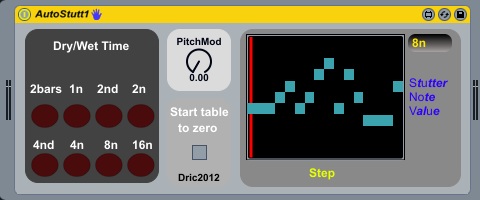 | Description: | Hello!! This is an Stutter semi Random.. Push the six buttons red at rigth, Define the table (X: Time, Y: Note Value) You can Module the pitch... (the red button do not triggers the notes value .. they triggered the "DryWet" effect on a syncronized time base) Sorry for my english, :-) I hope you understand me .. but it is really very simple device to use.. Bye.. ps:I 'tried it, but not for long times .. If you have a problem, bug or other please let me know .. thank you 1.1 Some improvments 1.2 i have just rename properly all parameters automatable 1.3 1.1 oops I forgot off freezer the device to include abstractions.. :( |