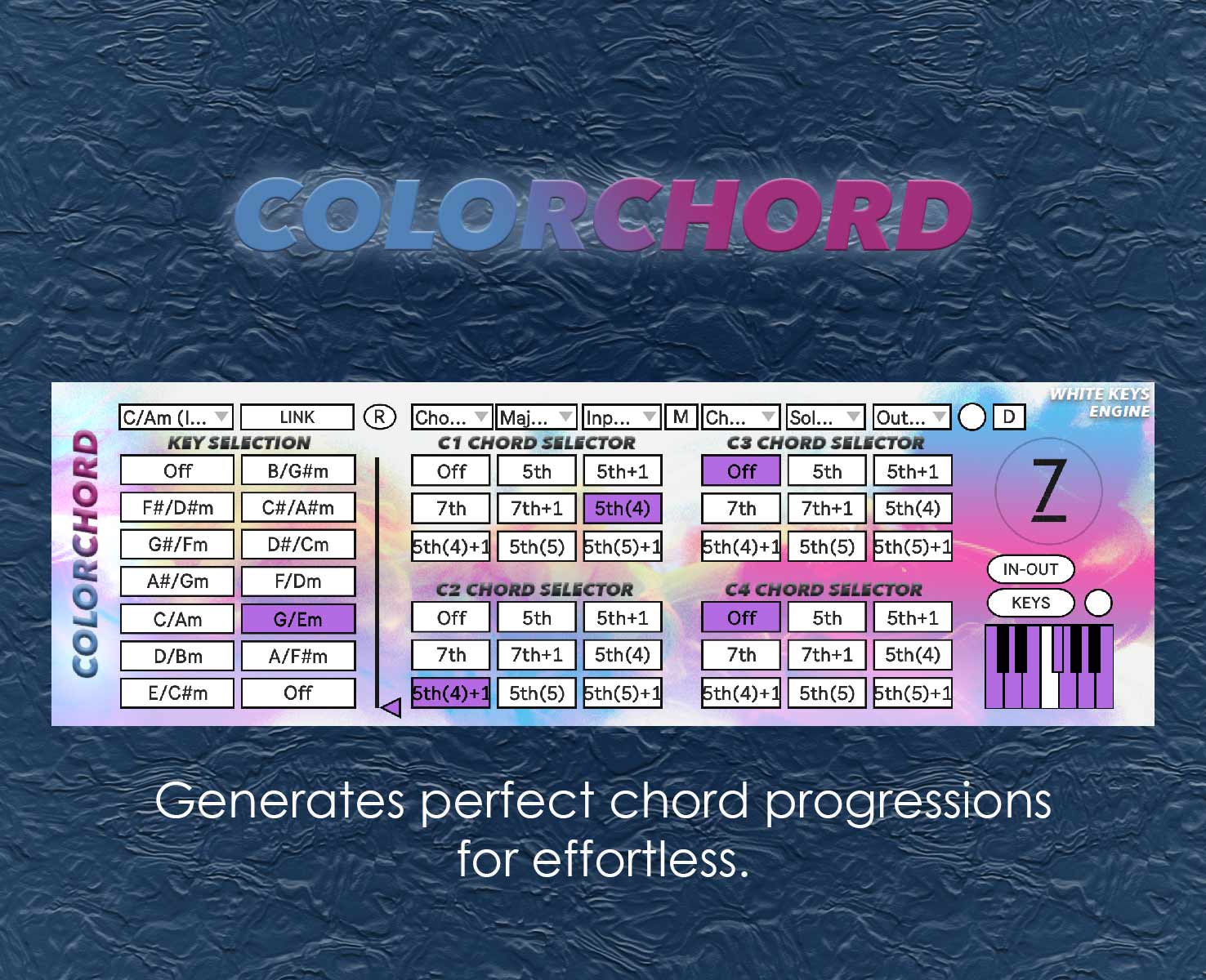| Description: | Demo videos available in 9 languages : www.zanetwice.com/my-tools/ 21 modes are now available. For those who have downloaded or purchased any of my software, updates are available in the download section of my website. Enjoy! ColorChord is a powerful plugin designed to generate perfect minor and major chord progressions, This plugin is essential for musicians and producers looking to create harmonious and sophisticated music effortlessly. What's new ? Version 1.6 Includes 21 modes: Major Scale, Dorian Mode, Phrygian Mode, Lydian Mode, Mixolydian Mode, Minor Scale, Locrian Mode, Harmonic Minor Scale, Locrian Nat. 6 Scale, Ionian Augmente Scale, Ukrainian Dorian Scale, Phrygian Dominant Scale, Lydian #2 Scale, Dorian #4 Mode, Phrygian Dominant Mode, Lydian Dominant Mode, Lydian Augmented Mode, Bhairav Mode, Melodic Minor Ascending Scale, Melodic Minor Descending Scale, Hungarian Minor Scale Version 1.5 Graphical interface upscaled: The graphical interface has been upscaled for a better visual experience. Version 1.4 Mode selection function added: The 7 major modes are available. Major Scale, Dorian Mode, Phrygian Mode, Lydian Mode, Mixolydian Mode, Minor Scale, Locrian Mode. Version 1.3 New White Keys Engine: Shifts notes to respect major and minor scale intervals, allowing easy playing with white piano keys. Generates perfect chords across 4 octaves, from C1 to C4. Divine Engine for Solo Notes: Plays notes with calculated intervals around the played note randomly, ideal for intuitive keyboard play. Randomization Function: Randomizes plugin parameters to generate new melodic ideas instantly. Pitch Adjustment: Allows individual pitch adjustments for input, chord, solo note, and output. MIDI Notes Display: Built-in screen to visualize MIDI notes input and output. Streamlined Functionality: Removed groove functions for a more efficient plugin. Link Function: Connects all tools for instant scale changes. Additional Tools: Divine - Randomly plays notes with calculated intervals for intuitive play. White Keys (Pro Edition) - Shifts the keyboard to play only white keys, avoiding wrong notes. Key Splitter - Divides the keyboard into assignable zones for live performance. MIDI Visualizer - Provides real-time visualization of MIDI data. Benefits: With COLORCHORD, experience the sensation of playing like a grand pianist without complex music theory. Simplify the creation of beautiful chord progressions and focus on your creative process. Enhance your music production and explore endless possibilities. |