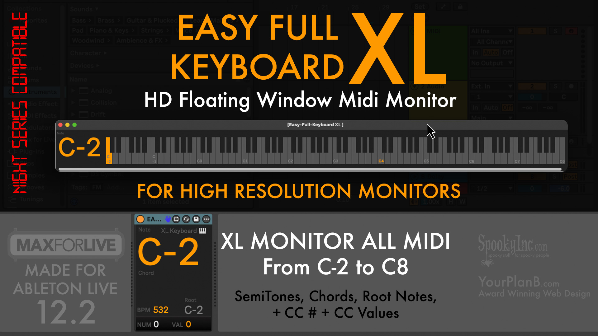 | Description: | This is a larger version of our floating window, complete range keyboard midi monitor MaxForLive device based on our popular Midi Easy Monitor this is a keyboard monitor that displays every single semitone from the lowest C-2 all the way up to C8 in a floating window It still displays the notes, root note, chord, CC# and CC value being played at any time inside of Ableton Live. The larger floating window shows the position on the keyboard as well as the name of the note and chord being played. Perfect for your High Resolution second monitor! And yes, it is still compatible with our NIGHT SERIES - just click the note to view the info in RED! Note: For Standard resolution + smaller monitors, please download our free smaller Keyboard Monitor https://spookyinc.gumroad.com/l/easyfullkeyboard-floating V002 Updates a conflict with Ableton's Round Robin button in Sampler. It should be working fine now! |