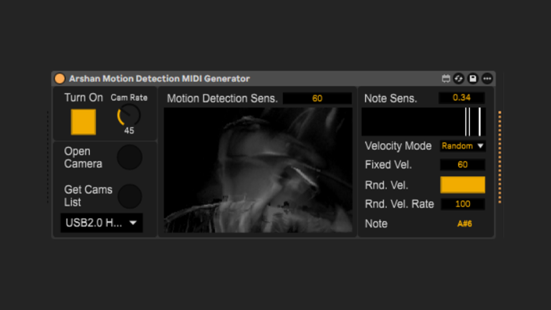 | Description: | Generates MIDI notes and provides Velocity and Key Modulations. This device uses camera-based motion detection to generate real-time MIDI notes and control data inside Ableton Live. Built in Max for Live, it translates visual movement into MIDI streams that can trigger instruments, modulate parameters, or create evolving generative performances. Full Overview and Tutorial can be found here: https://youtu.be/FqVuAZXRi2M |