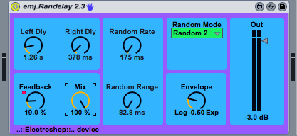 | Description: | emj.randelay is a stereo delay with two selectable random modes. in v.2.3 some bug fix and improvements. Random Delay Mode 1 ---> Fixed Random Range (Delay Time/2) Random Delay Mode 2 ---> Selectable Random Range (20 ms. min.) Random Delay Mode 1 Algorithm L Delay Time - L Delay Time/2 on Left Channel; L Delay Time + L Delay Time/2 on R Channel. R Delay Time + R Delay Time/2 on Left Channel; R Delay Time - R Delay Time/2 on R Channel. Random Delay Mode 2 Algorithm L Delay Time - Random Range/2 on Left Channel; L Delay Time + Random Range/2 on R Channel. R Delay Time + Random Range/2 on Left Channel; R Delay Time - Random Range/2 on R Channel. |