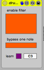 | Description: | * When two or more notes are received simultaneously, this effect will randomly select one of those and filter out the rest. * You can optionally bypass that filter for one note of your choosing (the default is C1, where we presume that your kick drum is found). * There's a Learn button associated with that input. Press it, trigger the note you want bypassed, and the device configures itself accordingly. (This may also usable for pitched instruments, though I've done some destructive things to the note durations, and it may not behave as you're expecting. Really, we're optimized for drums here) |