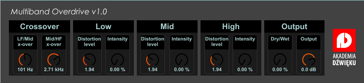 It is a simple 3 band overdrive. It gives a control over each band: drive factor, dry/wet (called intensity) and global dry/wet. You can also specify your own crossover frequencies and output "make-up gain".