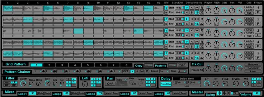Description: | Mixing different loops and make new one. update: v1.01 added "On Top" switch v1.02 multiple instance v1.1 improved cpu usage v1.11 modified random2 function There are "1 2 3 4 5" switches under "R R2 C" buttons. By these number switches, you can control which track will be included to random2. example If "1","3" and "4" are on, track 1,3 and 4 will be included to random2. So nothing happening to grids of track 2 and 5. version 2 http://hyakken1234.blog.fc2.com/blog-entry-58.html |
