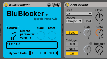 | Description: | This device is made to block certain values on a dial or slider, a typical example would be the BluBlocker controlling an arpeggiator sync rate and blocking 1/3, 1/6, 1/12 etc. so when you twist your dial it will skip these values and you can go straight from 1/2 to 1/4 to 1/8. It can be used on any parameter. Click the box on the bottom left then click the parameter you want to map, use the Control dial to choose a value you want to block and press the block button. Blocked values will show up in the text box below the buttons and you can even write them in yourself, they will always display as integers. To reset the list press the reset button. |