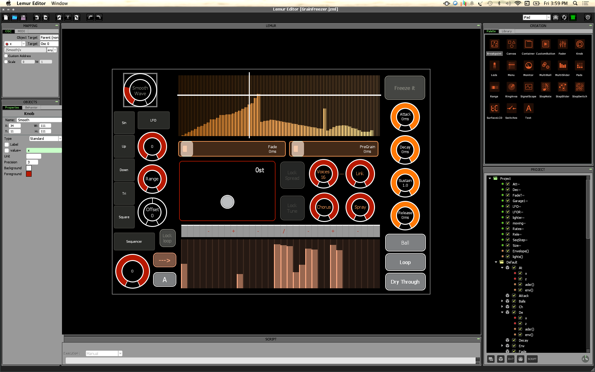 | Description: | watch this (crappy) video to see what Grain Hand looks like and does: http://youtu.be/AatTzsyPcXQ Grain Hand uses an M4l patch to connect to Ableton. It's a lemur layout for ipad, so you'll need lemur. I used Robert Henke's GrainFreeze patch and turned it into something completely different! It still freezes audio feeding into but can do this: --OSC to Max patch (no MIDI setup yay!) ----A live audio sampling granulator ----Waveform displays on Lemur and you can touch it to controll grain position and size!! --lfo and step sequencer to change grain playhead position! --trigger mode to turn into 1 voice ganulator with an ADSR --- all the other functions of Henke's GrainFreeze ***Set everything up and then press the buttons on the bottom right so that everything is in sync with the max patch it's really fun and maybe even practical. ****Make sure you know how to set up OSC targets on Lemur! ("host" name should be 'your computer's name'.local) questions/issues/comments/requests -- ndivuyo@gmail.com my stuff--- cargocollective.com/integrate |