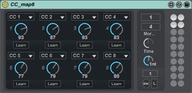 | Description: | CC map8 is a bidirectional CC controller to control your hardware with CC messages. Quick tips : - Set the device on a MIDI track - Arm the track and set the MIDI input and output in the Live i/o section. Functions : - Midi learn fonction to map easily your controller to the device. - CC menu to select the CC manually. - Preset section, (maj+click on circle to save) - Morph preset, select the 2 presets do you want morph between and move the "morph" Dial. - "Switch" button to automate morphing. - Adjust morphing time and Loop morphing. Update 1.1 - Set the Dials 1-8 to be the first parameters with Push/APC40 Please, if you use it, rate it, Thanks !! Check my others Device : http://www.maxforlive.com/library/index.php?by=any&q=veedjee |