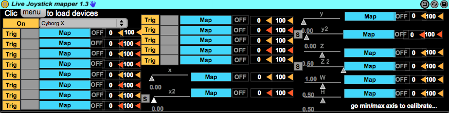 | Description: | Hi , This M4L maps any HID device (joystick, floor dance carpet, mice, etc.) into Live: - use ableton effectrack macros to map axis to several destinations. feedbacks: https://cycling74.com/forums/topic/joystick-to-m4l-mapper-how-to-make-it-versatile-and-turn-button-to-slider/ Enjoy ! 1.6.1: beug with faders management corrected update 1.6: preset managing adaptive input split axis update 1.3 : - toggle or trig - auto adaptiv scaling |