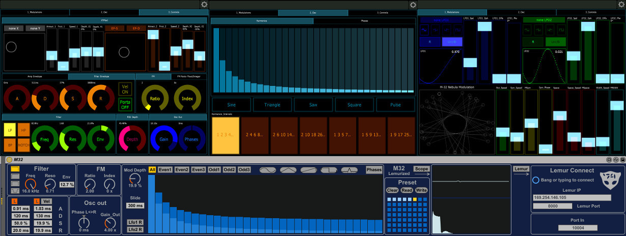 Description: | Hi, An other little blue synth! :) M32 Is hybrid Additive synth which can be controlled by lemur. Hybrid because that can be FM synth also. The 32 harmonics magnitude is modulated by 32 points of "breakpoint" in Lemur. Is an sort of LFO*32. All others parameters can be controlled in Lemur. All Modulations come from Lemur. Without lemur the magnitudes is down so no sound. There are 2 LFOs, wich can be targeted to any of synth parameters. And 2 Multiballs XY also can be targeted to all parameters of synth. You can shape Harmonic as you want, and in supplement there are some buttons to get basic waves. this work if the mode of harmonic is set on "all" otherwise if you set in mode even or odd you obtain strange wave form. All data from Lemur pass by "OSC 4" You need put the IP of your PC and port in OSC 4. In M32 you need put the adress (ip) of Lemur and port. The adress by default is my ip change it. The port is 10004 you can change as you want. (change in lemur also) There are an preset box that can be controlled by cc3. When you recall an preset all parameters is updated in lemur. Save presets before close your set! (And write on HDD) For the rest move the knob and open your ears :) The files for Lemur is here: https://drive.google.com/open?id=0B_hfRZ740YbmZ3JuelByaTVJZFE And here and little set with some not very musical examples. But is simply for try connection quickly, and see how it work. LiveSet: https://drive.google.com/open?id=0B_hfRZ740YbmZFZGTEZMYjFLZEE sometime for me the connection can take severals minutes. be patient :) Basically i build it for make drone or other fx sounds. But i test it on bass sound and other lead, and is so good also for them. |