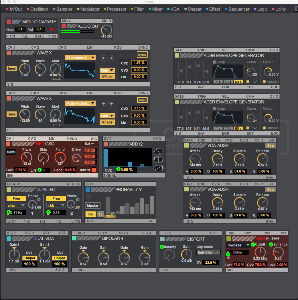 | Description: | XPads is a deeply-modulated polyphonic four voice synthesizer. At its core are four oscillators; 2 WAVEX, 1 RED OSC and 1 ADD12. The second WAVEX can be synced and FM may be applied. The RED OSC can also be modulated by just about everything. Macro 6 activates ADD12's CV2 frequency modulation. The final summed-signal is run through a distortion circuit and then onto the RED FILTER. Have fun!!! |