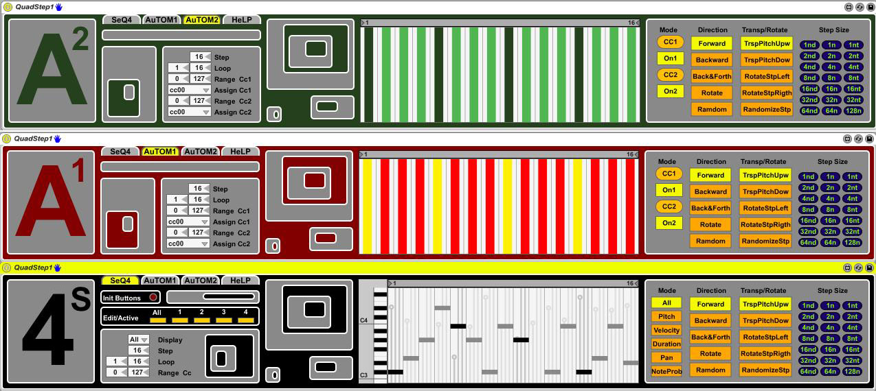 | Description: | 4 sequences + 2x2 CC sequencer. Help is in the patch. 1.1 i add Fold button and zoom. 1.2 i add button "Init loop" for recall the loops when you reload your set. 1.3 Some corrections of interface |