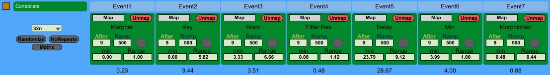 | Description: | Hi, This thing is based off of the Autechre statement about having "Conditionals" (Events) and after some of those conditions have occurred a number of times, then "Something" happens. In this version, a "Something" that happens is 1 of the 7 mappable controllers changes from its current position to a random position between min and min + Range, over a specified Ramp time (ms). There is an underlying metronome representing the speed of the Generic Events, or Ticks (32n is good). These Time Ticks trigger the Markov Matrix which generates any of the 7 Markov Events. The Randomize button randomizes the Markov Matrix, and the NoRepeats button zeroes out the diagonal of this Matrix, so that an event cannot trigger itself. "After" a Markov Event has accumulated a specified number of times, it triggers its "Something" i.e. its own mapped parameter change. Enjoy |