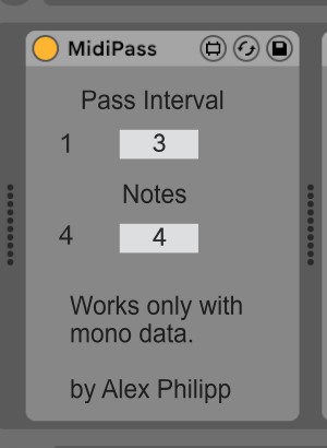 | Description: | MIDIPass is very simple MIDI patch that passes only specified of incoming notes. For example if it set to 5 it count to 5 and pass one note, than cycle repeats. It could be used for making pseudo chaotic melodies and FX hits. Just take your LEAD or BASS or other mono signal part and try some numbers. Also this melodies will be always in tune and fit all other parts. 1.2 Added passing notes number. Live 10 GUI 1.1 GUI update to Max 8 Check this gif to see how it works http://gph.is/2y9ZQiE |