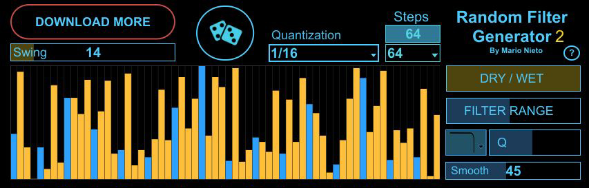 | Description: | Random Filter Generator 2 is a fx that can be applied to any sound and create new variations based on filters. We have 64 step sequencer, each step has a filter control that can be adjusted manually, or randomly with the random function. It has 4 types of filters (High pass, low pass, band pass and notch); Smooth sequences out with the "Smooth" function; Conotrol the frequency range; Mix original sound with processed sound using DRY / WET control (it is also possible to automate it). |