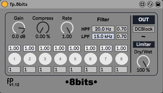| Description: | 8bits degrader effect inspired by OTO Biscuit gear. You can invert or mute each of 8 bits with gain, compress, sampling rate ratio and filters functions. |