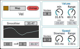 I've run across a problem with persisting settings: the "Min" and "Range" dials in the Values section both reset themselves to `0.24` when the Live project containing the device is loaded (and when closing the M4L editor window after viewing the device). I'm sure it has something to do with the `* 0.24` object feeding into both dials, but that's as far as I got.