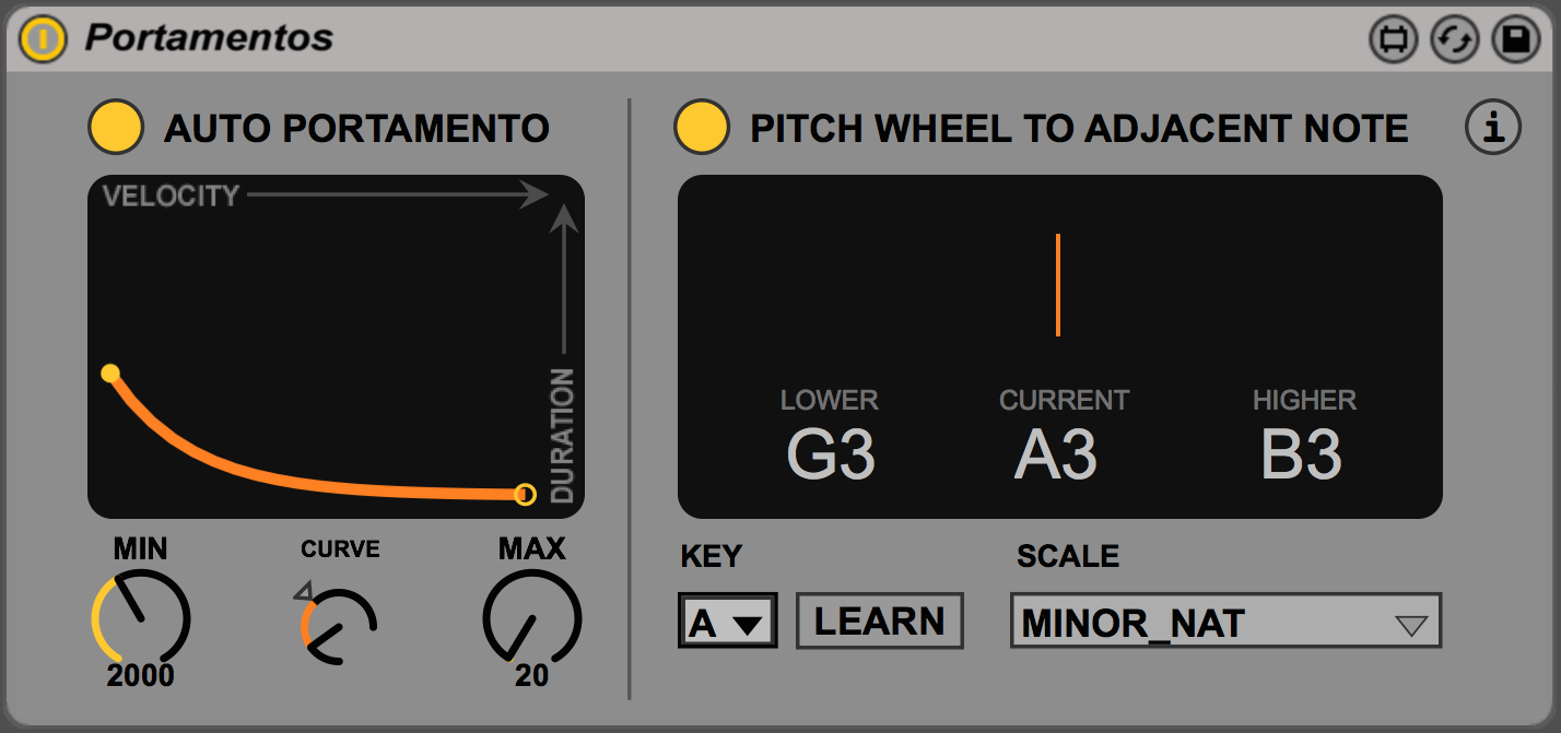 | Description: | Portamentos offers two useful tools: 1) "in-key" pitchbend scaling and 2) portamento slide duration from MIDI note velocity. Working with pitch bend can be a pain... When using the pitch wheel, it's easy to overshoot or undershoot the target note as the pitch wheel only controls a static semitone range. It's also challenging performing and editing portamento lines as synthesizers also have a static bend range and it can be difficult to figure out how a 14bit MIDI value corresponds to musical pitch. This Max For Live devices solves these issues, making performing and programming portamento slides quick and intuitive. There are two available modes: PITCH WHEEL TO ADJACENT NOTE:. * intercepts pitch-bend information and scales it to the key/scale you're playing in * moving pitch-bend up or down only slides to the adjacent note in the key/scale - no more, no less. * 20 available scale "mappings", including most commonly used scales AUTO PORTAMENTO:. * when playing overlapping notes, uses MIDI note velocity to determine duration of slide to the next note * editable velocity > duration graph for adjusting portamento response Developed with Live 9 / Max 6, but also tested working with latest versions of Live 10 / Max 8. Demo video here - https://youtu.be/lqn1nG_JbEU |