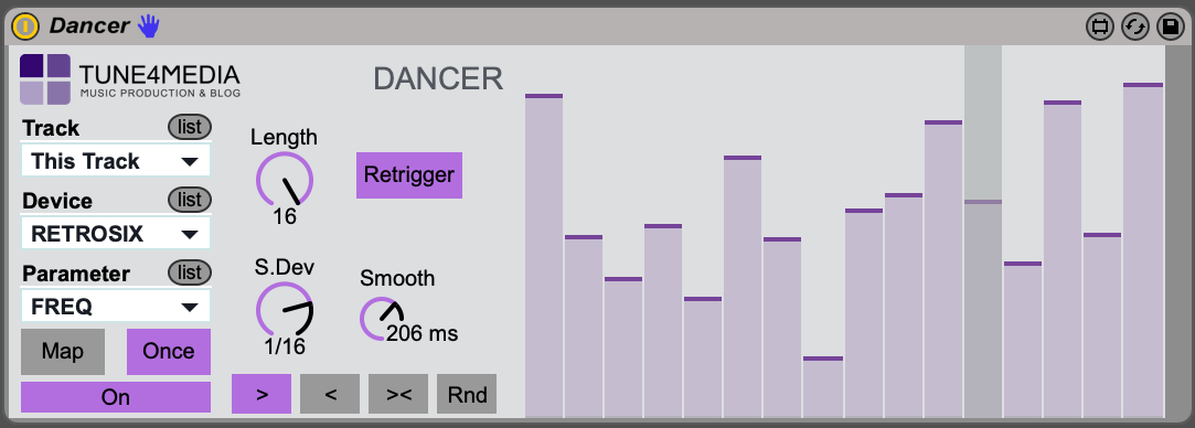 | Description: | Dancer is a very creative tool that lets you map and control any parameter within Ableton Live and send it through a sequencer. Essentially it allows you to create very sophisticated envelopes. The options with this device are limitless for a creative mind :) |