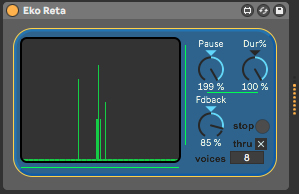 | Description: | EkoReta is a midi delay generator whose duration is not fixed but depends on the duration of the played note. voice = polyphony Assignable parameters : Pause = space between each repetition. Dur% = percentage of duration of repeated notes. Global Feedback you can combine it with itself or with other effects like arpeggiators, or else … Have Fun ! |