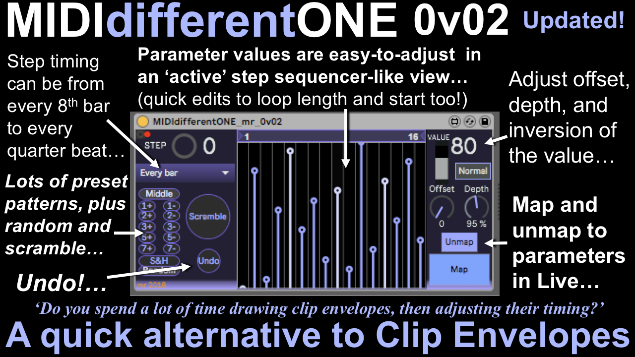 | Description: | MIDIdifferentONE is a alternative to clip envelopes that allows easy timing changes, easy editing, and looped repeats via a mappable parameter-outputting step sequencer. If you want every bar of a bass-line to have a different filter cutoff (to be precise, 16 different values), then this is the device for you. If you want to then switch to that cliched quarter beat S&H filter mod sound with a single pop-up menu selection then this is the device for you. Version 0.02 adds an 'Undo' button, so when you make an edit, you can go back! (Note: Only 1 level of undo...). Plus I tweaked the initialisation so that it starts from step 1 when you start the transport. The step sequencer is now 'mouse aware' when you stop Live, so you can then use the mouse to edit each of the steps and audition the effect of the parameter quickly and easily. (The little green/red indicator shows if Live is playing or stopped...and this controls if the mouse edits are active) More info: http://blog.synthesizerwriter.com/2019/10/different-every-time-changing.html |
