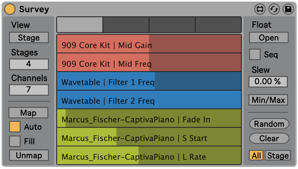 | Description: | Survey allows you to have any 16 parameters in your Live set mapped and modulated within seconds. In terms of speed and efficiency, it’s a multi-mapping dream-world and performance modulation paradise. Equally adept at both randomized scrambling and careful preset management, this device is sure to lend a number of extra hands in your sound design process. --- Ready, set, map. One of Survey’s standout features is an innovative mapping system designed to remove as much tedium from the setup process as possible. With Auto mapping, just focus on what parameters you want to take control of — Survey will figure out how to accommodate them. --- Performance Modulator Survey acts as a kind of macro control for your project’s most important parameters. Save collections of settings across multiple devices and tracks for simple recall or to creatively morph between them. Use the built-in sequencer to move between stages in step with Live’s clock. Stage selection is also mappable, so you can move between banks of parameter values however you choose. Survey multiplies the control power of your favorite MIDI dial, expression pedal, or Max for Live device. --- Fine-tuned output One way to ensure successful modulation is to simply disallow values that don’t work with a certain control. Min/max mode lets you quickly scale the range of each parameter mapped to Survey. --- Survey is designed to help you work with modulation more quickly and more creatively. To learn more about the device, check out the user manual or drop me a line at contact@patches.zone. |