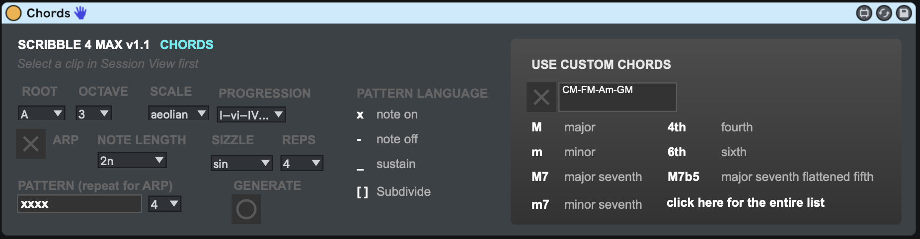 | Description: | Made with Scribbletune (the free and open source JS lib for creating musical patterns with JavaScript) This device is created to use the chords, progressions and arp methods of Scribbletune to generate quick Chord progressions. You can choose from over 100+ scales to generate interesting chord progressions based on scale degrees. It also has AB parts (and ABC parts) to create variations. It's free and open source: https://github.com/scribbletune/scribble4max Learn more about Scribbletune: https://scribbletune.com/ |