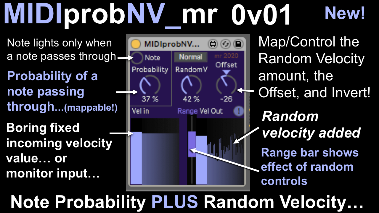| Description: | This device controls the probability of a note passing through, plus adds Randomness and an Offset to the MIDI Velocity. I use it to 'thin' tracks but with a bit of unpredictability, when arranging. This is part of the 'Prob' series of devices that do things with probability. This is the first non-drum, 'affects everything' device - previous ones have affected only individual notes (brill for drums!). I find that having history graphs of velocity is good when controlling the dynamics and timbre of a track, and the 'Range' block makes it much easier to visualise the changes to the velocity values. |