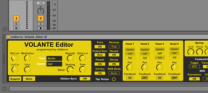| Description: | A Max4Live editor for the Strymon Volante pedal - enabling control of all the parameters and storage of their automation within your Ableton Live track. Included in the download are: Install Guide Manual Max4Live AMXD File Control every parameter of the effect pedal including the four playback heads, spring reverb and sound on sound settings. The device has an added function which enables it to Sync with Ableton Live's transport clock. Once purchased you can contact me any time using the built in Support button, with questions, ideas and suggestions. If you have any questions about the software, it's functionality or usage please contact me BEFORE purchase, as I do not offer refunds on software downloads. Required Software: Ableton Live 10 and Max4Live (included in Suite version) Required Hardware: Strymon Volante Please note: This is not a patch librarian, it will transmit parameter changes to the Volante but the software does not load and save patches. However, you may save sounds on the Volante,as described in the manual. This product is in no way affiliated with or endorsed by Strymon. |