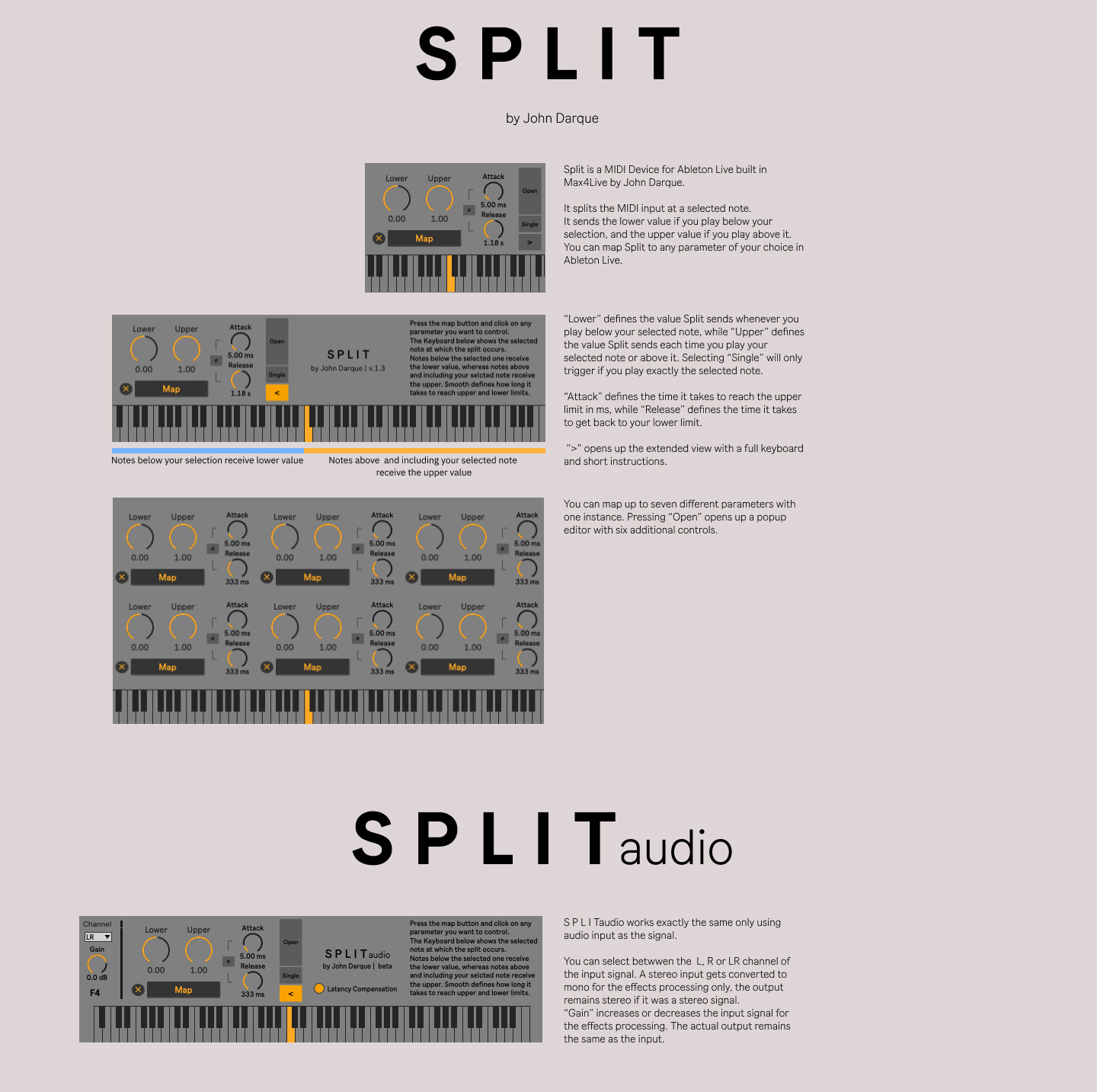 | Description: | Split is a MIDI Device for Ableton Live built in Max4Live. It splits the MIDI input at a selected note. It sends the lower value if you play below your selection, and the upper value if you play above it. You can map Split to any parameter of your choice in Ableton Live. “Lower” defines the value Split sends whenever you play below your selected note, while “Upper” defines the value Split sends each time you play your selected note or above it. Selecting “Single” will only trigger if you play exactly the selected note. “Attack” defines the time it takes to reach the upper limit in ms, while “Release” defines the time it takes to get back to your lower limit. ”>” opens up the extended view with a full keyboard and short instructions. You can map up to seven different parameters with one instance. Pressing “Open” opens up a popup editor with six additional controls. Split Audio works exactly the same only using audio input as the signal. Tested in Ableton Live 11. |