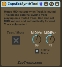 | Description: | Use this if you work with external synths that are mixed outside of Live. The problem when doing this: When muting a track using an "External Instrument" plugin in Live, it actually doesn't stop sending MIDI, it is expecting to mute the AUDIO... but if you mixing the synths externally, it will keep playing. Add this plugin to the track that drives your external synth. It will monitor the "mute" state of the track, and block the MIDI data if the track is in the "muted" state (notes only, other MIDI data still passes through). It also contains knobs for volume and pan of the external synth, with a "follow track" check box, which will automatically map these knobs to the tracks volume and pan. This allows you to use a control surface like an APC40mk2 to drive muting, volume and pan on external synths very easily. |