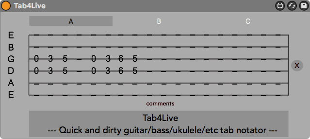 | Description: | A dirty and oversimplified tab notator MaxForLive device to quickly write down and save those chords! |
