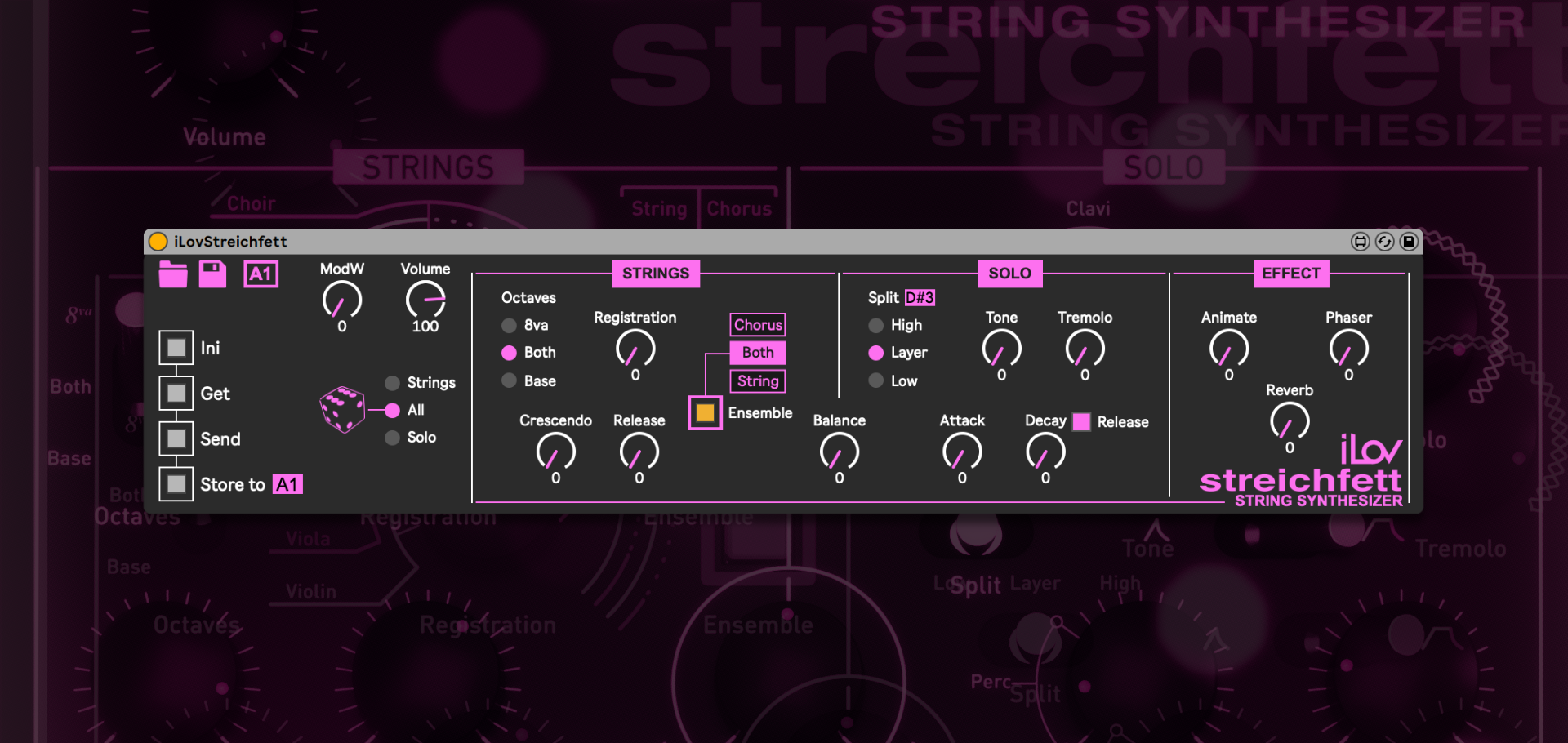 | Description: | iLov Streichfett is a Max For Live editor designed to easily control your Waldorf String Machine. Creating, editing, and saving your patches become child's play. A randomize button allows to effectively generate new sounds. All the Streichfett parameters can be automated and controlled with Push or another midi controller. Parameters values are automatically memorized with your Ableton session and sent to your Waldorf Streichfett when restarting. http://ilovmachines.com/product-streichfett.html NEW UPDATE: Load a sound stored in your Waldorf Streichfett. Save the curent sound in a Streichfett memory location (A1 to C4) Select the section(s) to randomize. Mod Wheel knob, split key added. A few minor bugs fixed and stability improved. The user manual has been updated too: http://ilovmachines.com/iLovStreichfettManual.pdf |