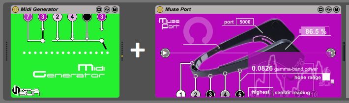 | Description: | Muse Port is an interface device that allows streaming of the data collected by Interaxon's brainwave-sensing Muse headband (http://www.choosemuse.com/) directly into Ableton Live. Five brainwave frequencies, three axes of accelerometer data, blink and jaw clench detection can all be graphed in real time along with your midi and audio recordings, as well as mapped to control any Live parameter. Muse Port is compatible with all versions of the Muse headband, although the newer heart rate and breath data streams will not be available if using the Muse 2 or S. To begin, you'll need to download Mind Monitor (https://mind-monitor.com/) and use your Android or iOS mobile device as a middleman. You can then connect the headband to your phone using Mind Monitor and it will stream the OSC data to Muse Port on your computer. Just make sure Muse Port is set to receive on the same port Mind Monitor is sending to (7000 default). That should really be all there is to it, but if you're not seeing any data come in to the device, try restarting Ableton Live, your computer or Mind Monitor. Sometimes the port can get claimed by a previous instance of something and need restarting to release it. The current UDP port, remaining battery life and the connection quality of the four sensors are all displayed in the top portion of the device. If there are one or more flashing circles in the headband-shaped icon, adjust the Muse on your head until all four sensors are reading well. Mouse over any of the numbered outputs along the bottom and a popup window will appear which displays a graph of the data streaming through it. Click along the wire leading to the numbered output to hold this popup in place. You may now select options in the popup itself. Sensor Mode Brainwave readings from the four sensors of the Muse can either be averaged as they arrive in the device or the highest can be used and the rest discarded. Hone Range Sometimes it can be useful to hone the range of the incoming data, in order to magnify its effect. If selected, the device will monitor readings and use only the highest and lowest it's seen to set the limits of the data stream, rather than the absolute full range of the sensor. The duration of this monitored history can be set via the Memory Span control in the settings. Clicking and dragging anywhere else in the popup will change the scaling of the graph. Click again on the wire to allow the popup to close. If you click on one of the numbered outputs itself a menu will appear. This menu displays all of the current mappings. Click 'Map New...' and then click on any enabled scalable parameter and it will be remote controlled by the data leaving the output. You can simultaneously map to up to four parameters per output. After a mapping has been assigned, you can click on its name in this menu to disconnect and remove it. Any of the data outputs may also be mapped through the main audio channel of the device itself. Click on the triangle-shaped input on the left and a menu will appear which lists all of the available connections. Alternatively, you may also map the actual audio signal passing through the device to any parameter you wish by clicking on the triangle-shaped output on the right. Click on the Muse Port logo to open up the settings menu. Memory Span For parameters with Hone Range selected, the device will look this many seconds into the past when determining the limits of its output range. Unlimited Memory Span The Memory Span will be as long as the time from when this, or the individual parameter's Hone Range control was selected. Automate Parameters The most convenient way to record Muse data in Live is to automate the parameter in question, thereby graphing it right along with your audio or MIDI recording in the arrangement view track. However, this unconventional strategy has its drawbacks. Namely the undo history will be compromised as it will perpetually fill while recording, which can be quite resource intensive both in terms of RAM and disk usage. Use with caution. Included in this download is a small companion device which generates midi notes based on an input stream. So for example, you could hone the range of the Relative Y-Axis Position output and send it to the Midi Generator to create a beat by nodding your head. Click here for the full description: https://sellfy.com/p/ns3f/. These are Max for Live devices. They require Ableton Live 9.1 Suite or newer and at least a trial of Max/MSP 6.1 or newer, which can be downloaded from http://cycling74.com/downloads/. Older versions of Live and/or Max may work just as well, but there are no guarantees. I'm always glad to hear feedback on my work! Please send any questions, issues or feature requests to to_the_sun@mail.com. And if you make something cool with one of my devices I'd really like to hear it! If you want I can do what I can to send some traffic to it, especially if it's on soundcloud. Mine's https://soundcloud.com/to_the_sun. Version 1.2 update Version 1.2 works with the latest OSC paths and also takes advantage of some of the newer measurements they added, such as absolute vs. relative brainwaves, as well as Concentration and Mellow scores. In addition if you click on the Muse Port logo you will see that streaming data (and therefore mapping it) must be turned on and is not on by default. Note that the five standard brainwaves report absolute values, whereas before they reported relative session values, and now there are five separate relative brainwave parameters which can be automated (graphed). The two experimental scores Concentration and Mellow can also be automated, and since version 1.2, they can be streamed in real time and therefore mapped to any parameter in Live. In the device they have taken the place of the 3rd and 5th outputs along the bottom. Previously these were the Alpha and Gamma outputs, from which Mellow and Concentration are derived, respectively. If you're savvy with Max for Liv