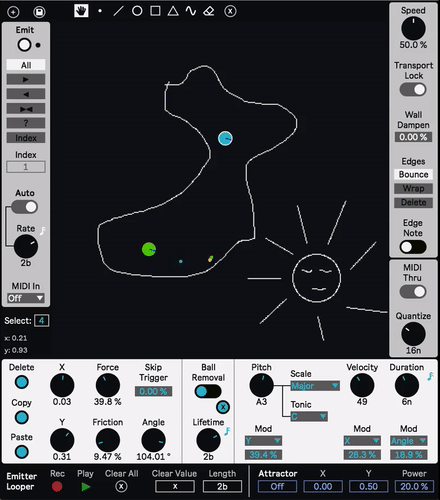 | Description: | Use various drawing tools to draw walls that balls can bounce off of. You can create up to 32 emitters to launch balls with different settings. When a ball bounces off of a wall, a MIDI note is output based on the settings of its emitter. Use Divisions to create various different MIDI effects in a less conventional way! Whether a sequencer, arpeggiator, melody/counter point/chord generator, note delay, or whatever else you come up with! Teaser video: https://www.youtube.com/watch?v=kgbbAtBWxJs Walkthrough: https://www.youtube.com/watch?v=rbchYS_s5ZE Features: Various cursor modes for drawing walls, and more: Emitter selector cursor for selecting, moving, and rotating emitters Free draw tool Line draw tool Ellipse, rectangle, and triangle shape tools with rotation and arc options Sine wave draw tool with phase and frequency options Eraser and clear drawn walls function Up to 32 emitters with independent settings that launch balls: XY Position and angle of launching balls Force of launch Friction for the balls (slows them over time) Chance of skipping ball launch triggering Two ball removal modes: after a certain interval or number of wall hits MIDI note pitch (the note it outputs when colliding with a wall) Various pitch scale options and tonic option MIDI note velocity MIDI note duration with sync options Modulation sources and bipolar amounts for the MIDI note pitch, velocity, and duration Modulation options include: Ball position (X and Y), distance from the center, speed, angle, index of total balls, random spray, number of hits left Functions for copy and pasting emitter settings to each other NOTE / DISCLAIMER: Emitter parameters cannot be modulated, automated or mapped! This is to avoid creating 32 instances of emitter settings which would make long loading times for the device. To compensate for this there is an internal parameter automation looper for the emitters described below! Various methods for triggering emitters to launch a ball: Manual and auto triggering at a set interval Various options for choosing which emitter is triggered Ability to have incoming MIDI notes trigger emission and even control when balls are removed Simulation speed option Lock to transport Various edge handling modes Note output interval quantization Emitter Parameter Automation looper, which loops changes in Emitter parameters Attractor/Repeller for adding simple attraction physics to the balls A small auxillary device called Divisions Listener, which allows sending MIDI notes from different emitters in once device instance to seperate tracks in Ableton so that you can control various instruments from one device. More: dillonbastan.com |