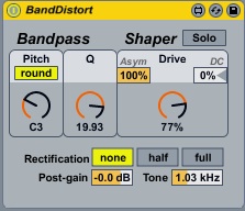 | Description: | Distorts a particular frequency region. Use it to add subtle grit to pads, or go for full-blown distortion effects. Asym determines how asymmetric the signal is that the waveshaper sees, which means that it controls the level of the even harmonics you'll get in the sound. When it's at 0%, you'll only be generating odd harmonics. Post-gain and tone allow you to shape the result. The drive parameter can make the sound substantially louder, so these controls can help pull it back into the mix. For extreme effects, try cranking the drive and adjusting the DC factor with Rectification set to "half". The solo button allows only the bandpass signal through to the output. Check out my other devices here: http://www.maxforlive.com/library/index.php?by=author&q=PeterMcCulloch&submit=Search |