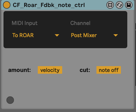 | Description: | Place this device before Roar. It puts Roar automatically in "Note" feedback mode and you can "play" the feedback via MIDI. You can link the velocity to the amount of feedback and either keep the last value or cut it with notes off. Make it scream ! Update : v1.01 amount source (manual/velocity) is properly working if you load Roar when after the device were loaded. |