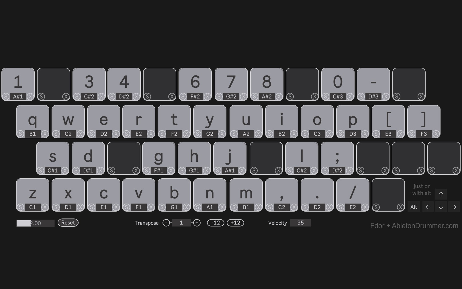 | Description: | MIDI Keyboard is a MIDI plug-in that allows you to extend the standard one octave when playing on a laptop or computer keyboard. This is an extended plug-in. Added pitch and velocity controls using the arrow keys. Fixed bugs such as pitch going out of bounds. The default layout now is set to the standard QWERTY (the original plugin was German). Sorry for my stupid mistake that made the plugin not work — I fixed it! With thanks to Tobias Hunke (blog.abletondrummer.com/eula)! |