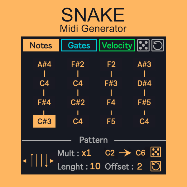 | Description: | Endless Midi generation in midi clip with one of the most downloaded and beloved max for live device. Thank you all for that ! little demo : https://youtu.be/-qIWuy8hYTk !!!! Requires ableton live 12 with the new powerfull fonctionnality of the midi generator !!!! Just drag and drop the file to your user library to install it... original version : https://maxforlive.com/library/device/4771/mdd-snake thank you for your support |