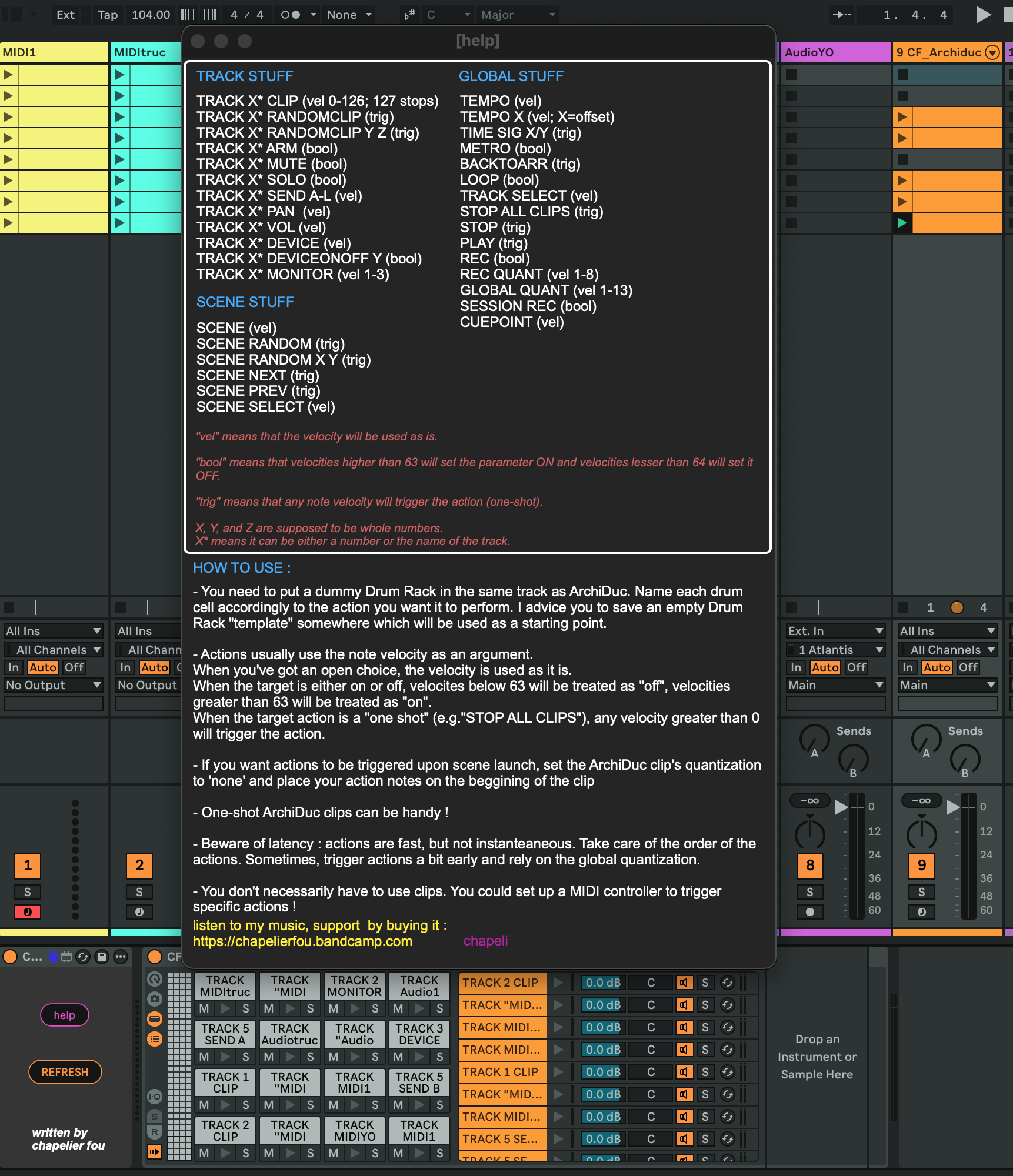 | Description: | This is my new free M4L device, "Archiduc". It allows you to trigger various actions in your Ableton Live Set from a single MIDI track, using MIDI notes sent to a Drum Rack which chains are named accordingly to the actions. VIDEO PRESENTATION HERE : https://www.youtube.com/watch?v=hqaDSmPzz-U UPDATE 20250904 : Total rewrite of the internals : - FIX : simultaneous actions would not work properly - IMPROVEMENT : TRACK actions can be now be called by track names, which is quite a game changer as you can now reorder tracks without breaking the actions (just hit "refresh" after moving tracks) - ADDED : TRACK X DEVICE : selects devices - ADDED : TRACK X DEVICEONOFF Y : enables/disables a specific device UPDATE 20250630 : Addition of TRACK X RANDOMCLIP TRACK X RANDOMCLIP X Y CUEPOINT |